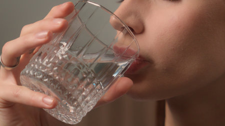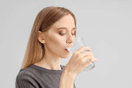 On white grey background 30s woman profile face holds glass of water, copy space for advertisement text or benefits list - helps maintain body fluids balance, keep skin looking good close up concept