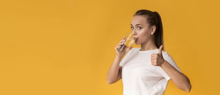 Pretty girl drinking water from glass and showing thumbs up gesture, posing over yellow background in studio, panorama with copy space