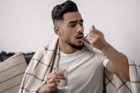 Man with Cold Sitting on Sofa in Checkered Blanket. Man at Home. Sick Young Man. White Sofa in Room. Unhappy Guy. Disease Concept. Healthcare and Healthy Lifestyle Concept. Drinking Medicines.