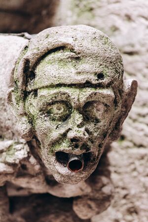 An aged stone gargoyle sculpture is the focal point, positioned on a building's facade. Water flows from its mouth. The image highlights the detailed texture and color of the stone against a blurred background. This photograph is suited for architectural studies, historical presentations, and various commercial applications.
