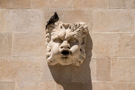 Pigeon sitting on carved face of rainwater spout in the old town of Dubrovnik in Croatia