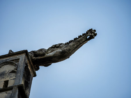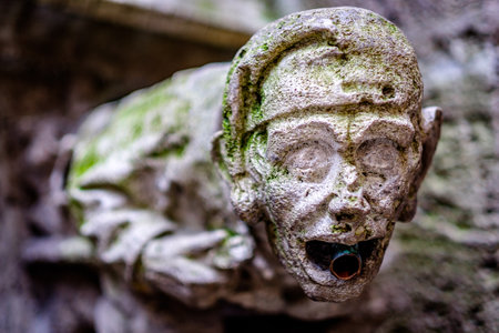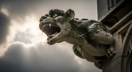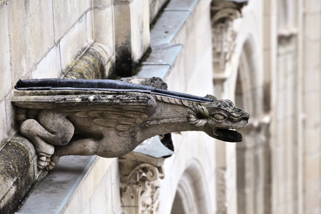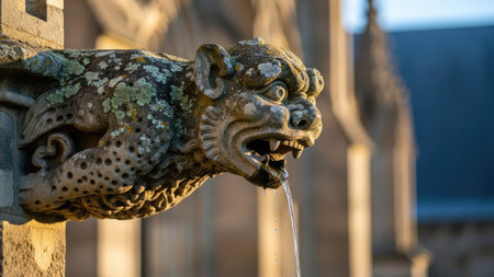 An aged stone gargoyle sculpture is the focal point, positioned on a building's facade. Water flows from its mouth. The image highlights the detailed texture and color of the stone against a blurred background. This photograph is suited for architectural studies, historical presentations, and various commercial applications.