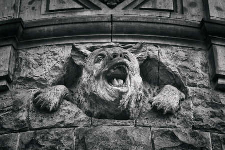 Czech architecture, scary goat gargoyle sculpture, gothic temple decoration. Medieval art, mystic gargoyle monster statue, St. Vitus Cathedral.