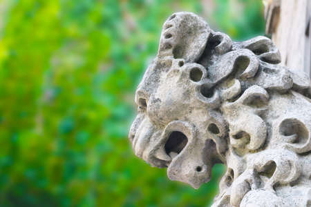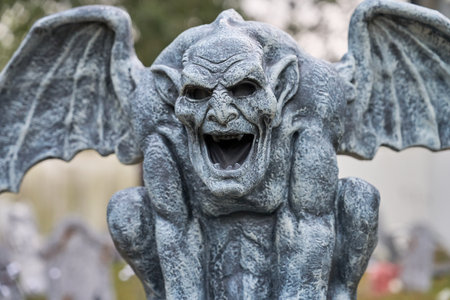 A detailed view of a winged stone gargoyle with an open mouth and sharp teeth. Weathered texture and gothic style make a scary Halloween decoration.