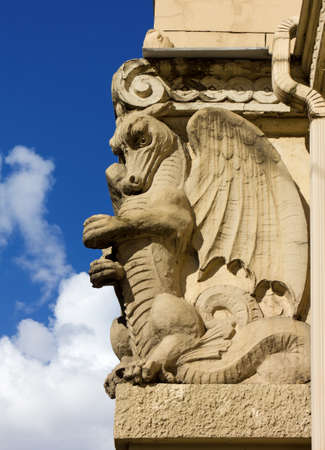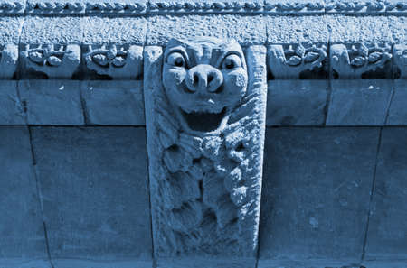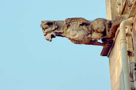 Closeup of gargoyle on cathedral facade in the street on blue sky background