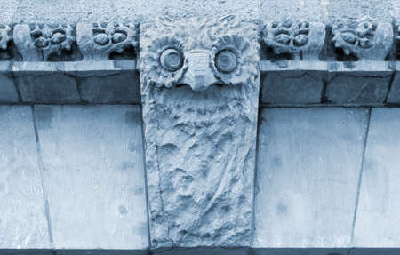 Shot in black and white detail on the facade of this historic building representing some character, animal or flower. Set at Lloret de Mar, Girona, Catalunya, Spain, Europe
