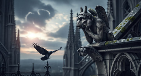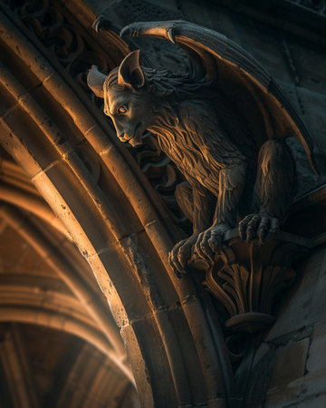 A gargoyle perched atop a Gothic cathedral, bathed in the soft glow of twilight, shadows tracing its form