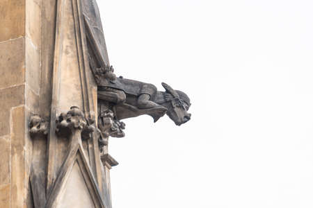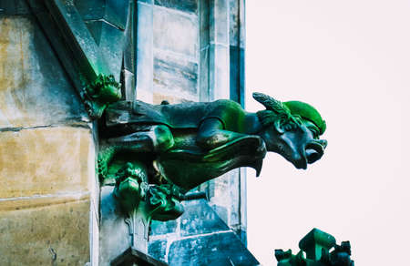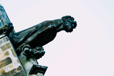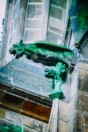 Czech architecture, scary gargoyle sculpture, gothic temple decoration. Medieval art, mystic gargoyle monster statue, St. Vitus Cathedral.