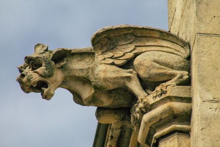 Winged creature gargoyle of gothic York Minster cathedral, England, UK. Close up