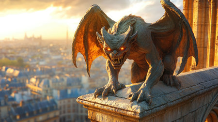 Fiery-Eyed Gargoyle - Gothic Architecture, Sunset Watcher