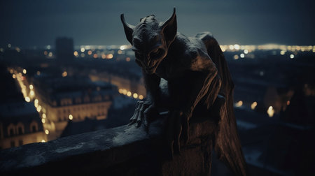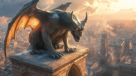 Gargoyle Statue with Cityscape - Gothic Skyline, Sunset Guardian
