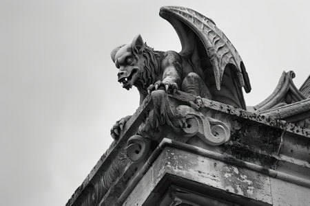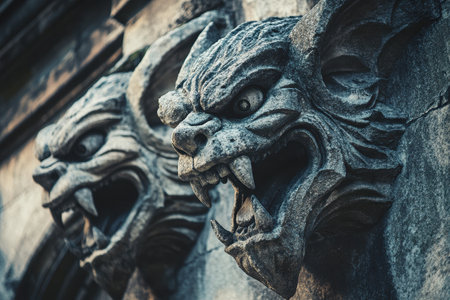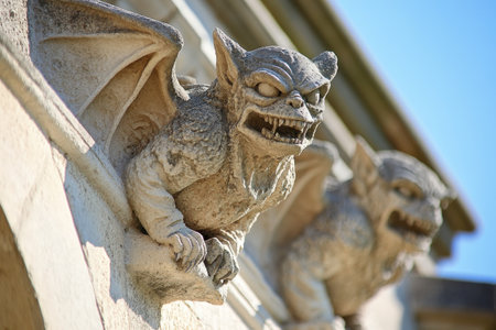Intricately carved stone gargoyles with wings and fierce expressions adorn a historic structure during bright daylight. Their intimidating presence enhances the architectural beauty.