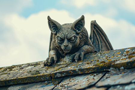 stone gargoyle crouching on mossy rooftop, staring ominously into the distance.