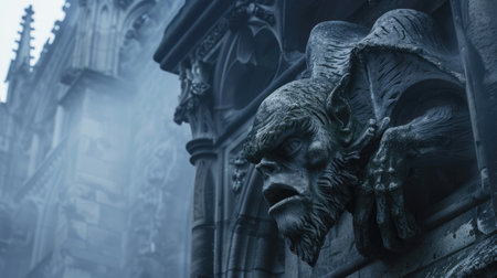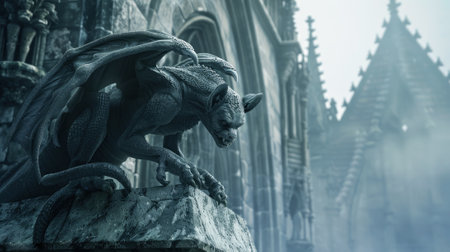 Gargoyle on Gothic cathedral, old monster statue in mist close-up. Vintage stone demon sculpture on church wall background. Concept of scary chimera, culture, devil and fantasy. Generative AI