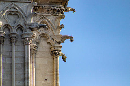 France, Paris, June 2022. Detail of the chimeras on the facade of the cathedral of notre dame