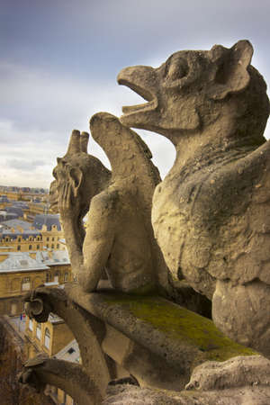 Chimeras gargoyles of the Cathedral of Notre Dame de Paris overlooking Paris, France