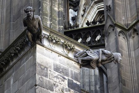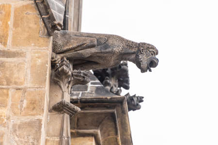 Prague, Czech Republic - August 17,2019: Close up view of gargoyle in the Cathedral church Sacred Vitus. The gargoyle is a highly decorative spout, allowing water to be channeled away from buildings.