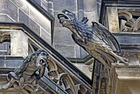 Czech architecture, scary gargoyle sculpture, gothic temple decoration. Medieval art, mystic gargoyle monster statue, St. Vitus Cathedral.