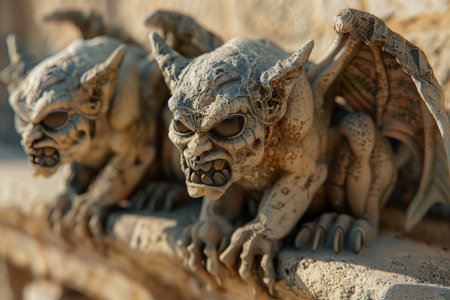 A close-up view of detailed stone gargoyles perched on a gothic cathedral. The intricate craftsmanship and soft light create a striking visual contrast, showcasing architectural artistry.