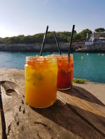 Flavored citrus drink in glass on table, sea water in the background