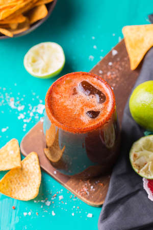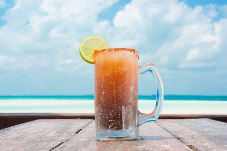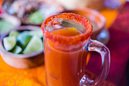 Traditional Mexican michelada in glass mug with blurry background