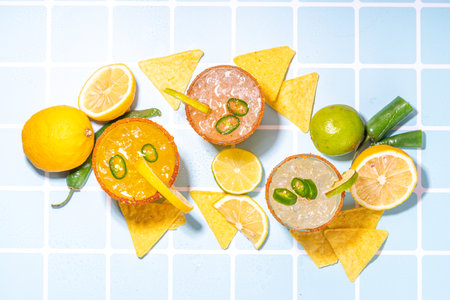 Set of tequila margarita mexican cocktails, with jalapeno pepper, lime and spicy rim, on high-colored tiled background copy space