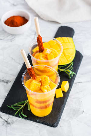 Mangonada mexican smoothie from mango with chamoy sauce and tamarind straw in plastic glasses. vertical view