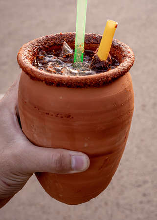 Delicious traditional Mexican clay jugs from Jalisco with lemon soda, tequila, tamarind and ice with a straw on top.