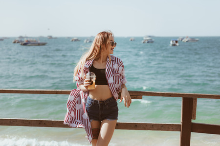 Attractive young woman standing on wooden pier in front of sea with boats