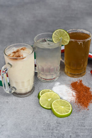 Mexican drinks Horchata water, Lime juice and beer on a gray table with salt pepper and lime