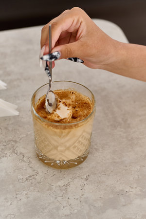 Hot coffee pour on top cold milk and cream in shot glass.