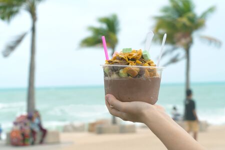 hands holding mixing chocolate shaved ice in a plastic cup with seascape background
