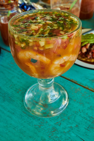 Shrimp cocktail served in a glass with avocado and broth ready to eat