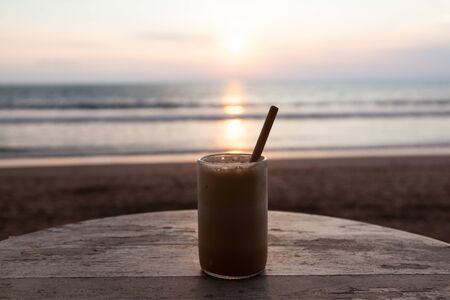 coffee drink with a straw on the background of the ocean sunset
