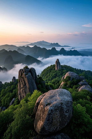 Famous Ulsanbawi Rock against the fog seorak mountains at the Seorak-san National Park, South korea