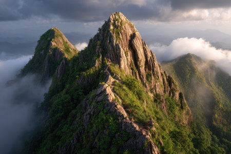 The image features majestic mountain peaks covered with green vegetation, set against a backdrop of a cloudy sky. The lighting creates a sense of depth and highlights the textures of the mountains. This scene could be used in various commercial applications, including landscape photography, travel advertisements, and environmental content.