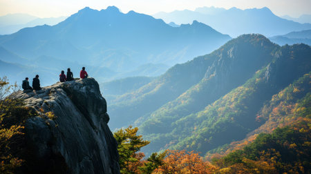 A tranquil moment at the scenic Jirisan National Park, with hikers enjoying the stunning mountain views.