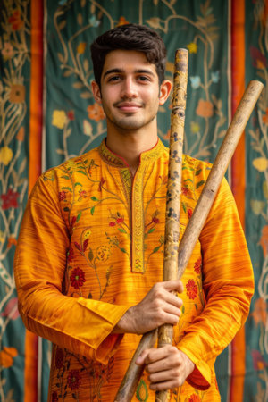 Smiling young man in traditional Indian outfit holding dandiya sticks during festival. Portrait of Indian man in festive ethnic dress