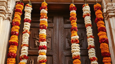 Beautifully arranged floral garlands in vibrant colors hang close to a traditional wooden door, showcasing the rich cultural heritage of India.