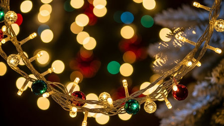 christmas garlands on a green Christmas tree, macro photography, beautiful bokeh