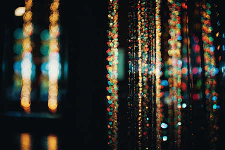 Colorful flower garland with lights enhances festive atmosphere in indoor setting during evening hours