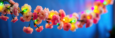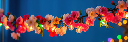 String of colorful lights with artificial flowers hanging against a blue background for festive decoration in a celebration setting