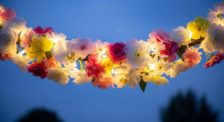 Colorful garlands adorned with flowers and twinkling lights enhance the ambiance of a joyous gathering. This lively decoration brings warmth and cheer to the event.