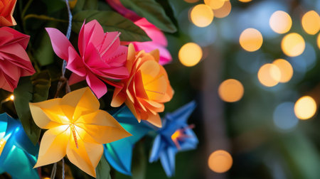 Beautiful arrangement of colorful paper flowers illuminated by soft lights, creating a whimsical and festive atmosphere perfect for celebrations and events.