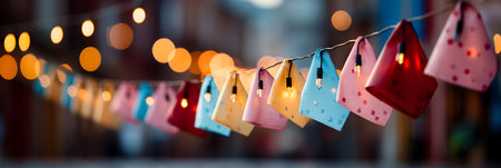 Colorful paper candles hanging on a rope with bokeh background