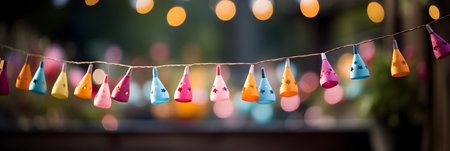 Colorful paper party hats hanging on a string, bokeh background