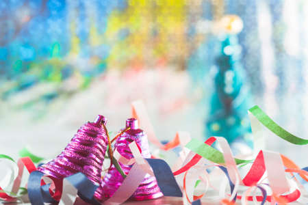 Christmas and new year greeting card. Blurry background. In the foreground, scattered confetti and two Christmas bells are a Selective focus.