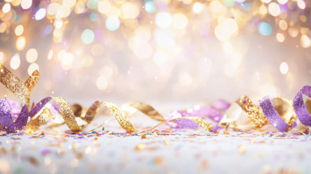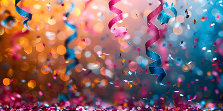 Colorful confetti and streamers against bokeh background, creating festive atmosphere