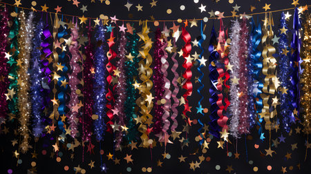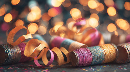 Vibrant streamers hanging gracefully create a festive atmosphere. The soft bokeh lights in the background add a dazzling touch, perfect for celebrations.