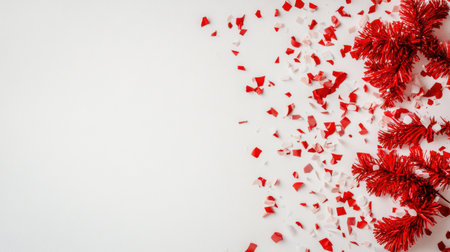 Colorful festive tinsel and confetti falling with white background, AI Generated
